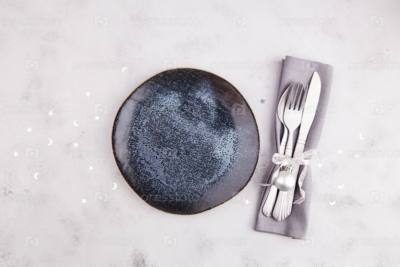 Сервировка рождественского или новогоднего стола. Тарелка, столовое серебро, декор на светло-сером фоне