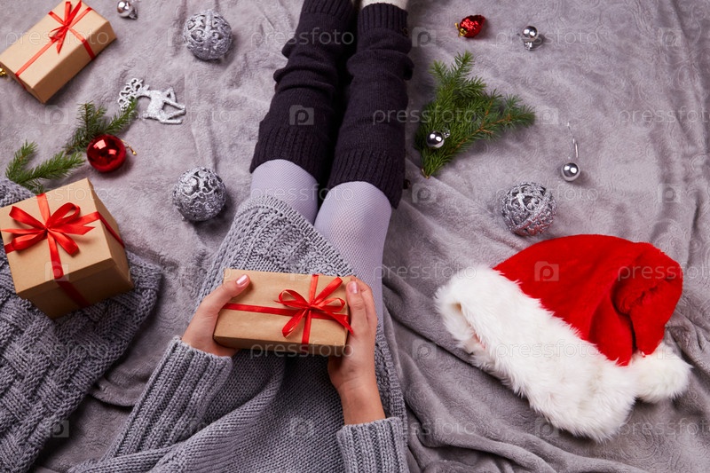 Уютная атмосфера Рождества, праздника. Маленькая девочка в вязаном сером шерстяном свитере держит подарочную коробку