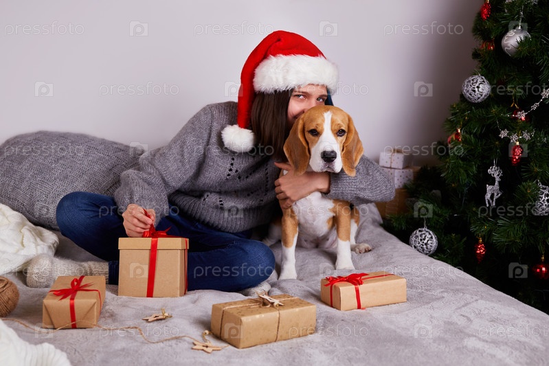 Девушка в шапке Деда Мороза держит в руках подарочную коробку