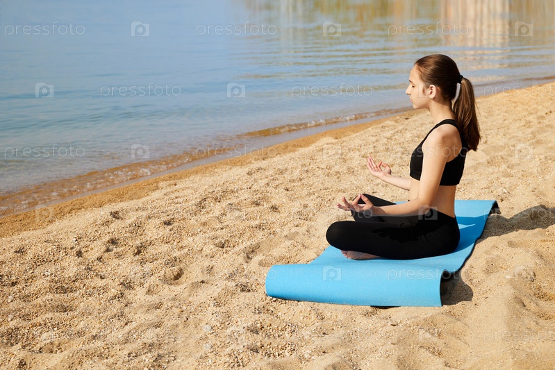 Молодая девушка сидит в позе лотоса с закрытыми глазами на песчаном пляже. Время для йоги. Медитация и отдых