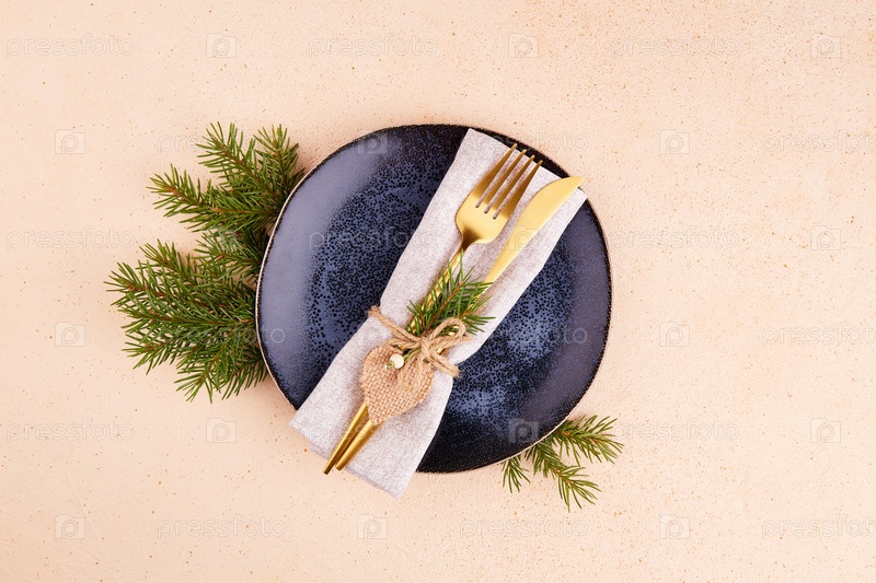 Сервировка рождественского стола. Винтажная тарелка, столовое серебро, еловые ветки, праздничный декор