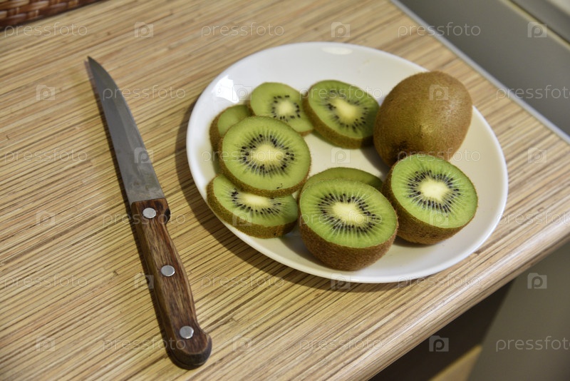 Кусочки зеленого киви на тарелке. Вкусный фруктовый завтрак