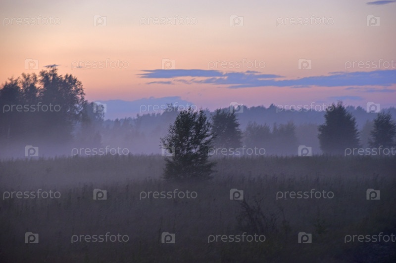 Лесной пейзаж вечером в тумане вечернего солнца