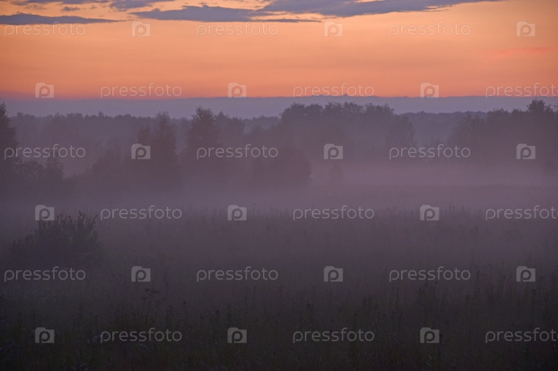 Лесной пейзаж вечером в тумане вечернего солнца