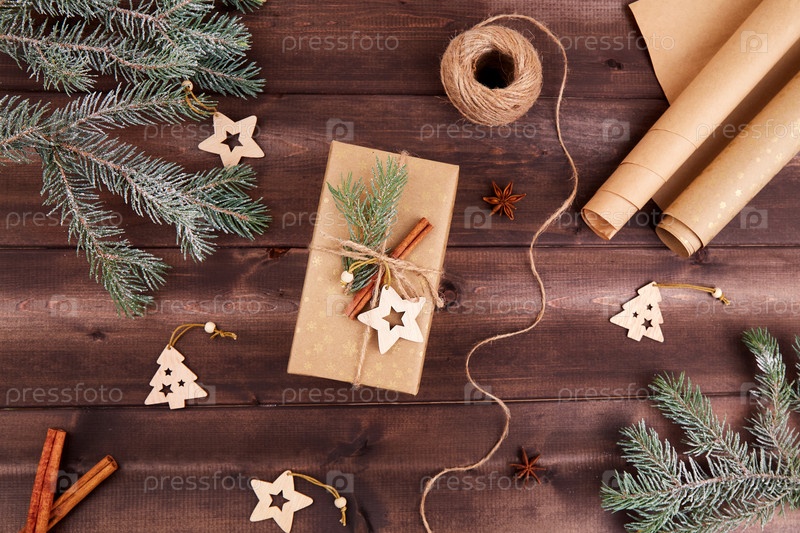 Еловые ветки, подарочная коробка, оберточная бумага, палочки корицы, деревянные елочные игрушки