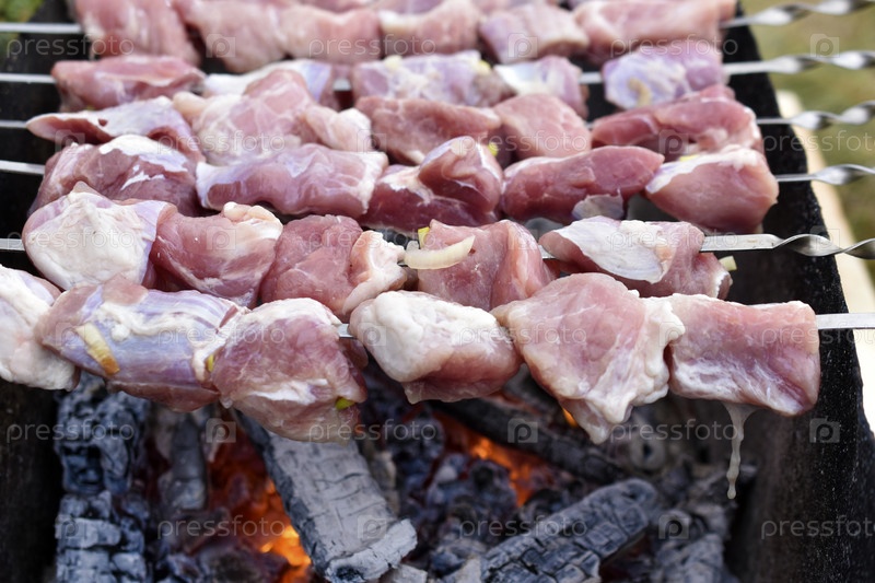Сырая свинина на шампуре для барбекю