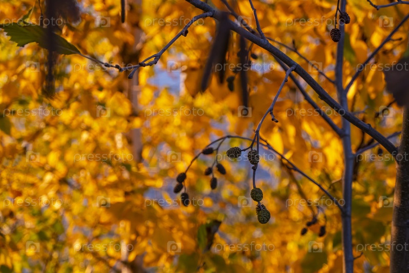 Ярко-желтые и красные осенние листья висят на ветвях деревьев в лесу. Тема - осень, бабье лето, красивое увядание природы. ольха