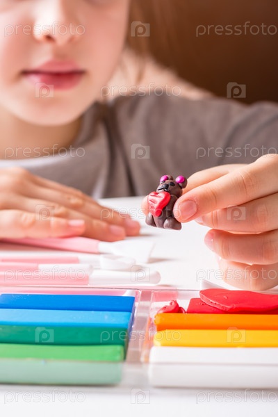 В руках девочка держит мишку из полимерной глины. Ручная работа и отдых. Вертикальный вид