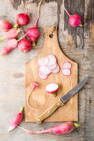 Свежий нарезанный редис и нож на разделочной доске на деревянном столе. Овощи для вегетарианской диеты. Деревенский стиль. Вертикальный и вид сверху