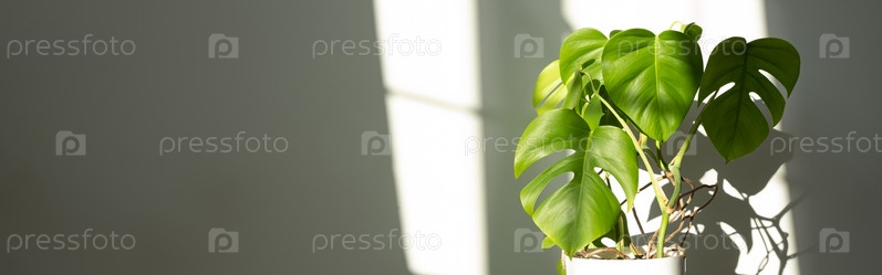 Баннер. цвет монстра в белом горшке на сером фоне. Концепция минимализма. Monstera deliciosa или швейцарская сыровая фабрика на фоне тропических листьев в горшке. резкие тени