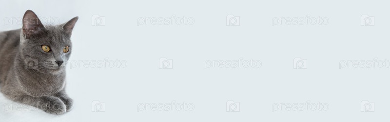 Баннер. Серый кот с желтыми глазами лежит на сером фоне. Всемирный день кошек
