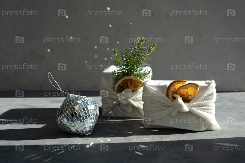 Безотходная подарочная упаковка в традиционном японском стиле фурошики на сером фоне 2022