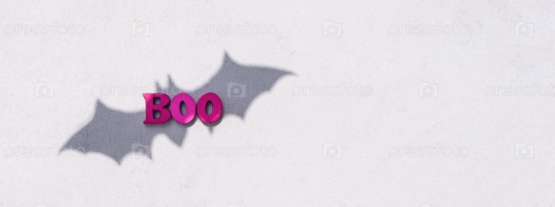 Модный минималистичный бетонный фон для праздника Хэллоуин. Бу слово. Черная летучая мышь