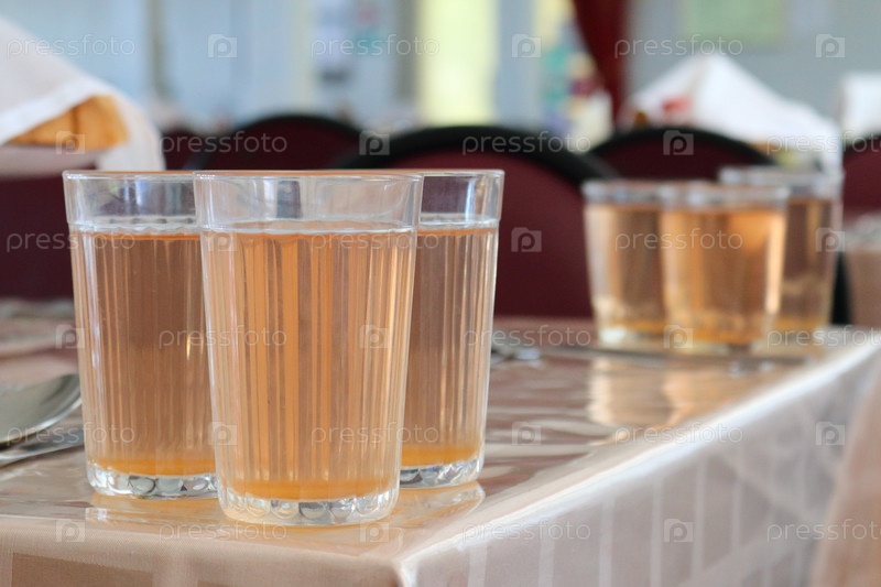 Яблочный компот в стакане на столе в столовой
