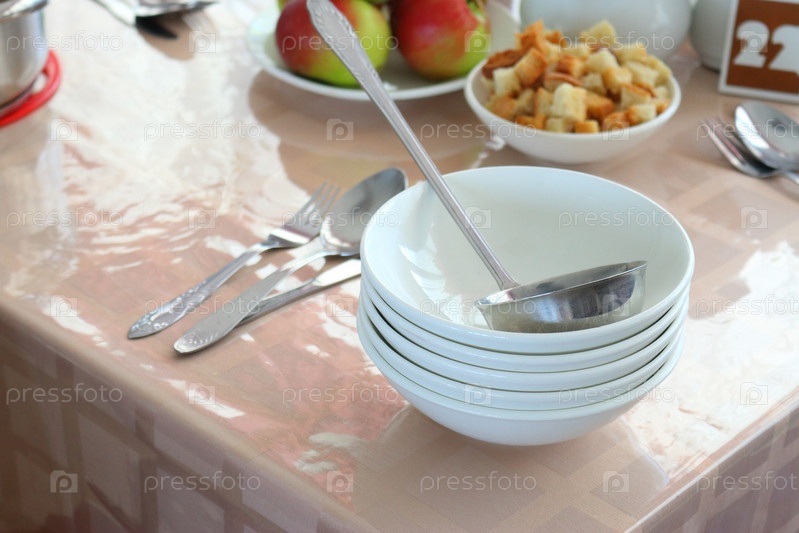 Тарелки для супа и черпак в столовой