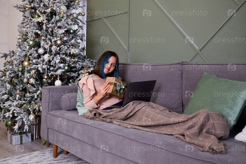 Красивая девушка показывает подарок через экран ноутбука. Елка с игрушками и подарками