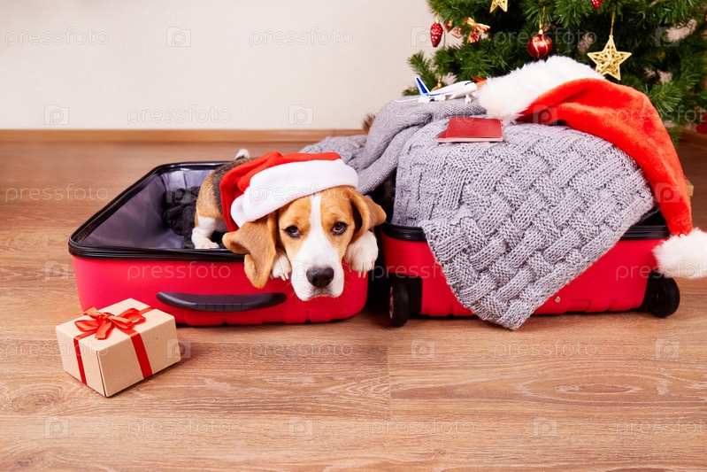 Путешествие на рождественские каникулы. Собака бигля в шляпе Санта-Клауса в чемодане с одеждой и подарками