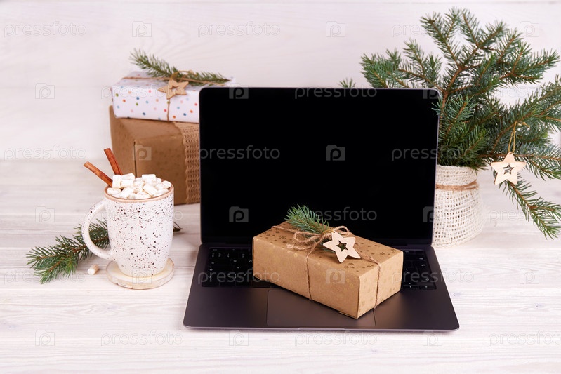 Интернет-магазины к новогодним праздникам. Экран ноутбука, кружка какао с зефиром, подарочная коробка,