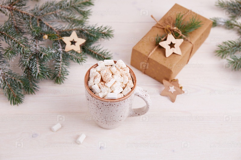 Рождественский праздник фон, баннер или открытка. Еловые ветки, кружка какао с зефиром