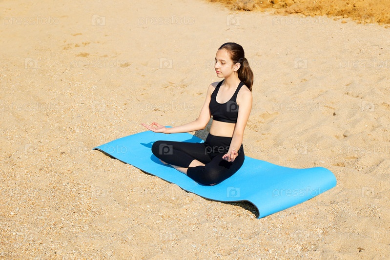 Время для йоги. Молодая девушка сидит в позе лотоса с закрытыми глазами на песчаном пляже