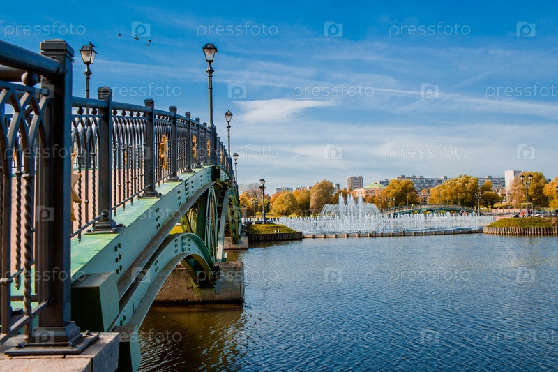 Россия. Царицынский парк в Москве в солнечный осенний день. Вид на реку, мост и большой фонтан. Царицынский парк — одна из главных туристических достопримечательностей Москвы