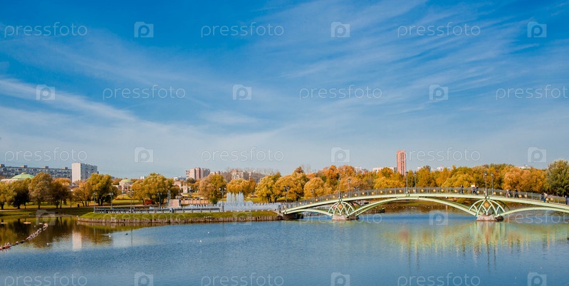 Россия. Царицынский парк в Москве в солнечный осенний день. Вид на реку, мост и большой фонтан. Царицынский парк — одна из главных туристических достопримечательностей Москвы