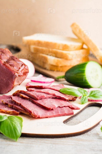 Пастрами из свежей нарезанной мраморной говядины, огурец, редис и базилик на разделочной доске. Американский деликатес. Деревенский стиль. Вертикальный вид