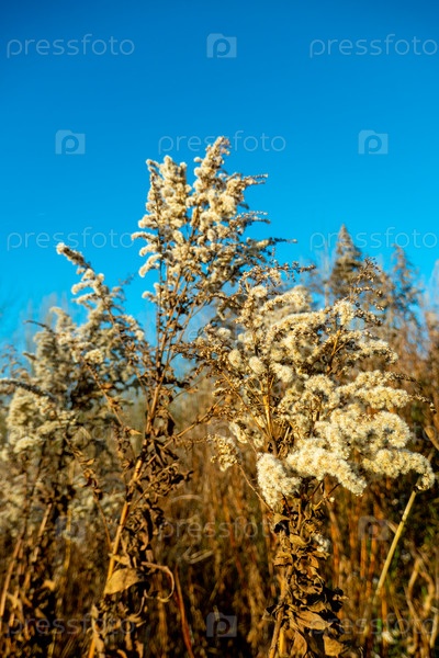 Сухая трава на фоне ясного голубого неба в солнечный день на открытом воздухе. Абстрактный естественный фон в нейтральных тонах
