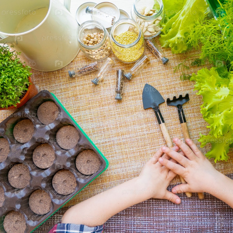 Торфяные горшочки, инструменты и почва готовы к посадке семян. Выращивание рассады для сада. Плоская лежала с детскими руками