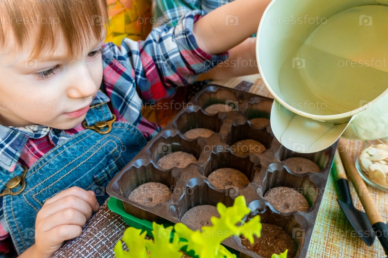 Ребенок поливает семена, посаженные в торфяные таблетки в лотке