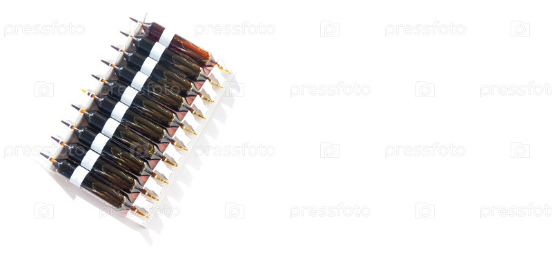 Группа ампул с прозрачным лекарством в медицинской лаборатории. много ампул на светлом фоне. баннер с копией пространства