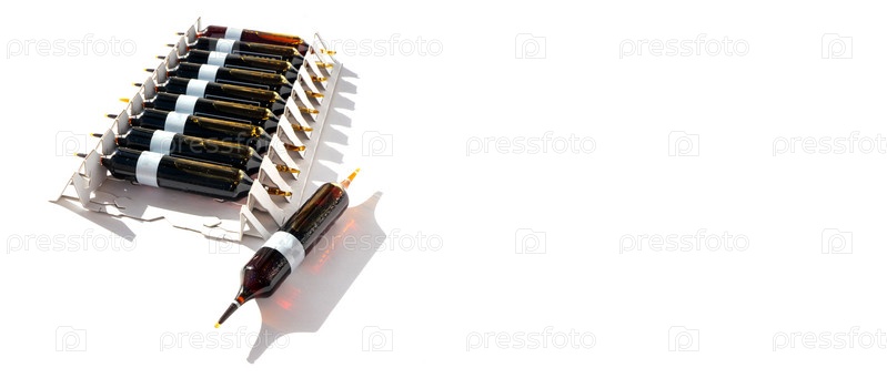 Группа ампул с прозрачным лекарством в медицинской лаборатории. много ампул на светлом фоне. баннер с копией пространства
