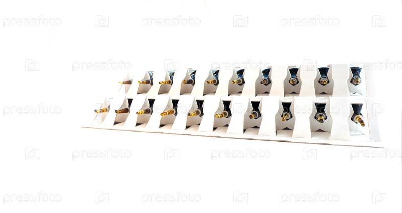 Группа ампул с прозрачным лекарством в медицинской лаборатории. много ампул на светлом фоне