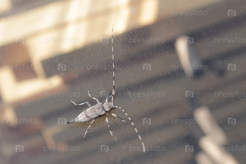 Жук с длинными усами сидит на грязном стекле. жук древесный жук на фоне деревянных материалов