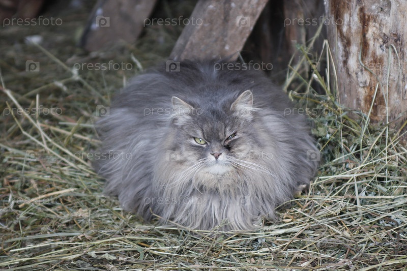 Пушистый кот лежит на сене