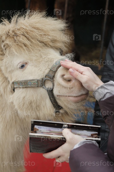 Девушка гладит мордочку пони. В одной руке у нее кошелек