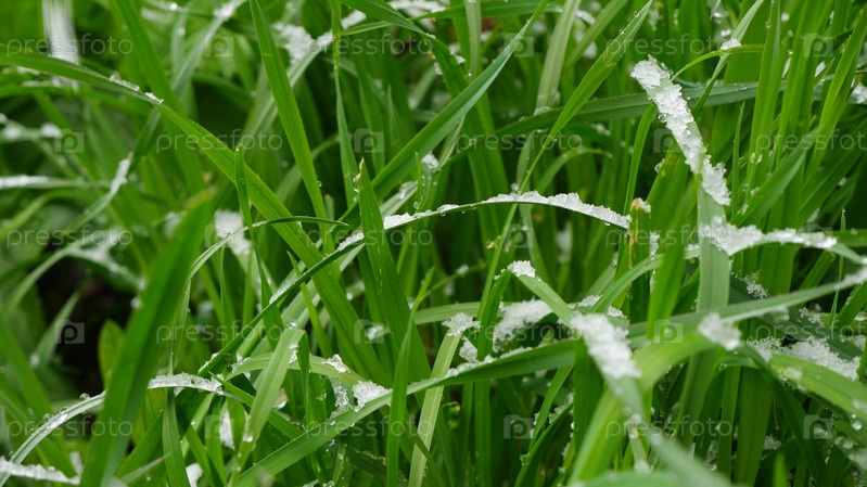 Растущая зеленая трава под снегом. Аномальный снегопад в США. Нарушение климата. Снег на траве