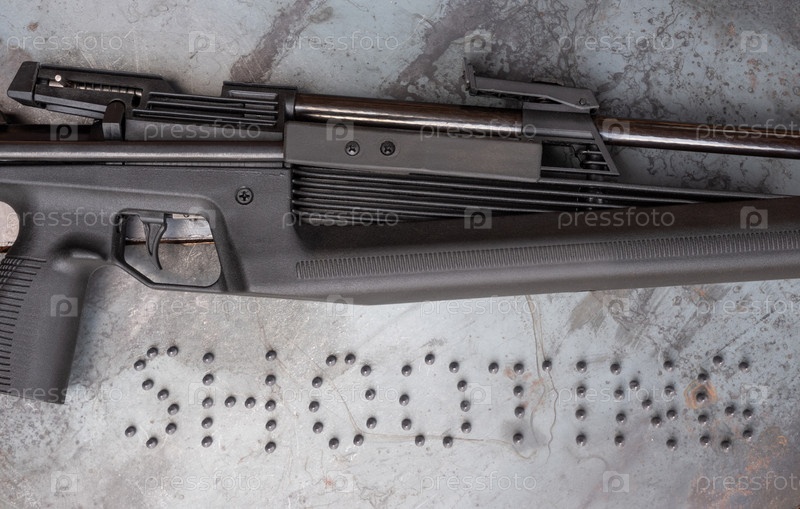 Слово «стрельба» выложено пулями рядом с черной пневматической винтовкой, лежащей на стальном столе. пневматическая винтовка лежит на фоне стали крупным планом. пневматическая стрельба