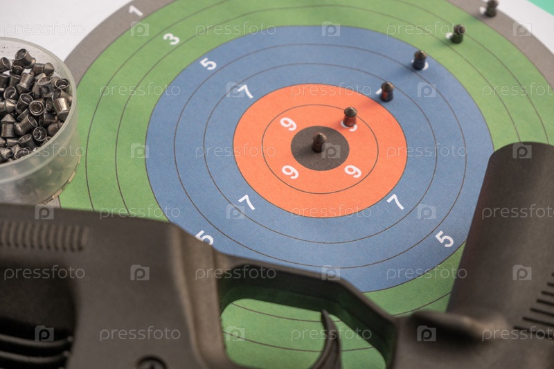 Пневматическая стрельба. пневматическая винтовка и пули на фоне цветной мишени