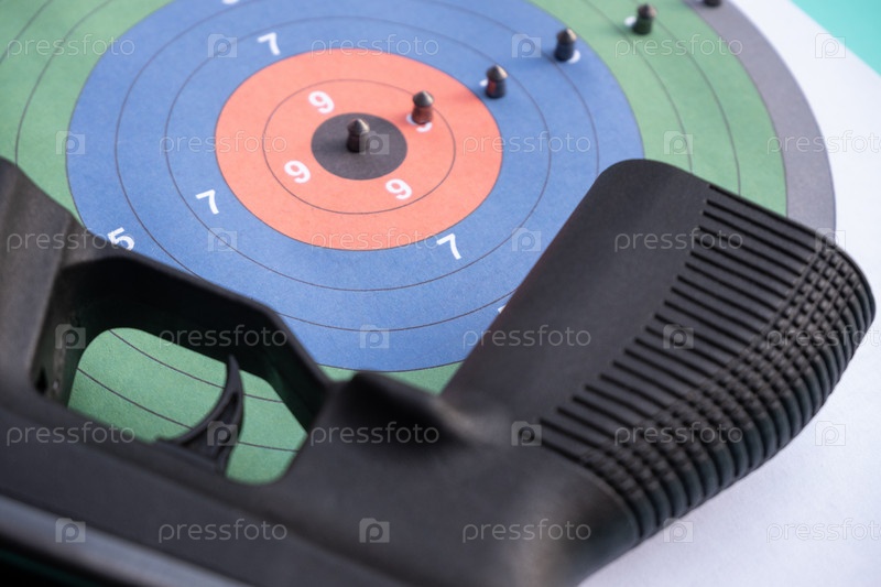 Пневматическая стрельба. пневматическая винтовка и пули на фоне цветной мишени