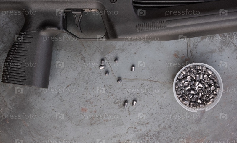 Пневматическая стрельба. пневматическая винтовка и пули на стальном столе. На фоне стали крупным планом лежит черная пневматическая винтовка, рядом разбросаны патроны
