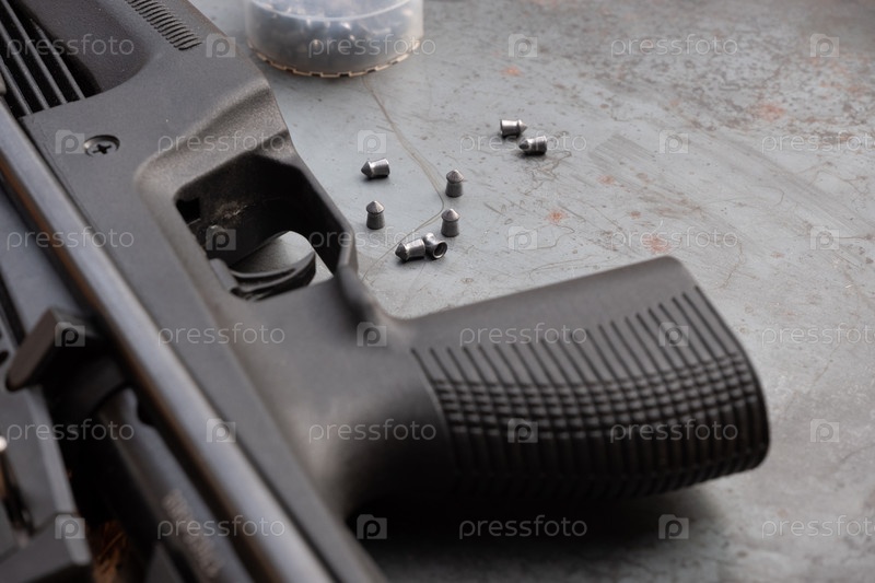 Пневматическая стрельба. пневматическая винтовка и пули на стальном столе. На фоне стали крупным планом лежит черная пневматическая винтовка, рядом разбросаны патроны