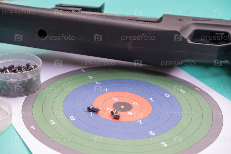 Пневматическая стрельба. пневматическая винтовка и пули на фоне цветной мишени