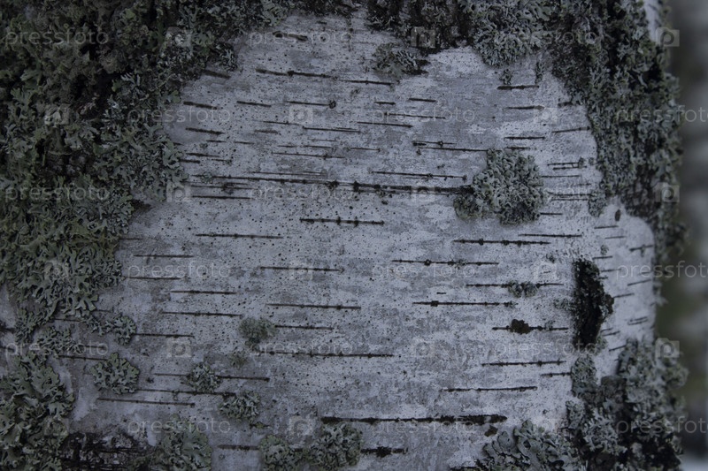 Русская береза крупным планом, мох, покрытый берестой