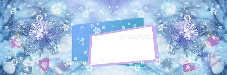Широкоэкранный новогодний расфокусированный фон с текстовой рамкой и украшенными елками. Художественный дизайн, баннер