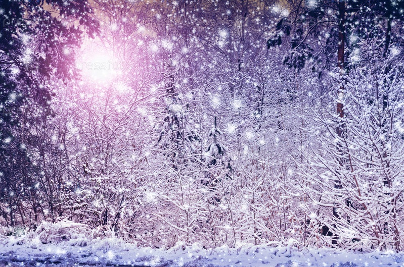 Зимний лесной пейзаж с лучами солнца сквозь заснеженные деревья и эффектом падающего снега