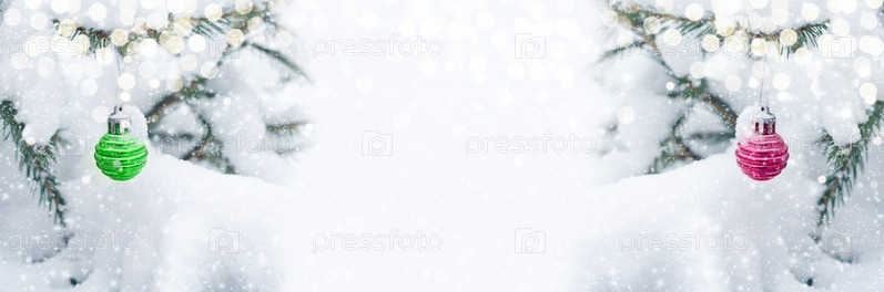 Рождественский расфокусированный широкоэкранный фон с воздушными шарами на елке и боке. Новогодний зимний арт-дизайн, баннер