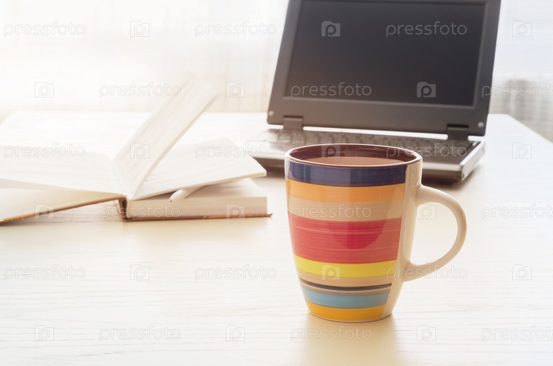 Рабочее место за столом возле яркого окна, кружка кофе на размытом фоне ноутбука и ноутбука