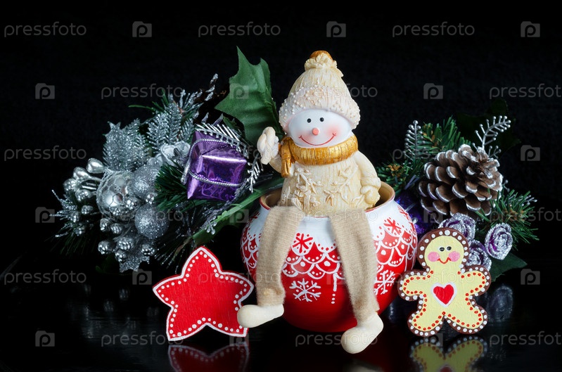 Игрушечный снеговик и рождественские украшения на черном фоне