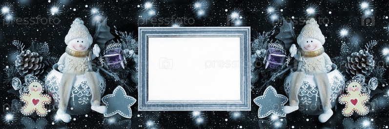 Широкоэкранный рождественский черный фон с игрушечными снеговиками, небольшим фейерверком и фоторамкой для текста. Частично тонированное изображение